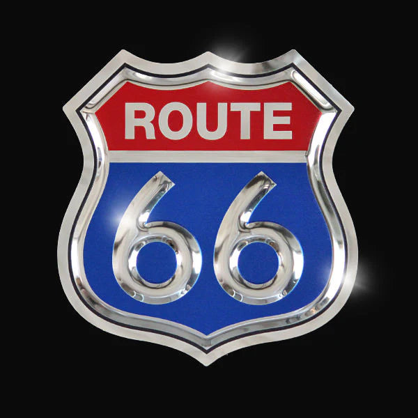 12-inch Route 66 stainless steel metal sign for your garage, bar, home, recreational room, or man cave. Mirror polished, embossed stainless steel with high-definition color detailing. Made in the USA by hand.